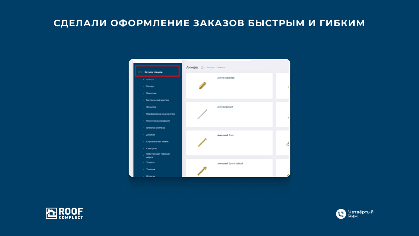 Тысячи наименований и долгое оформление заказа. «Руфкомплект» занимается оптовыми продажами крепежа и комплектующих для строительства. У компании более 16 000 товаров и 1 500 клиентов по России. Продаж много, у каждого товара несколько фасовок, а у клиентов — разное количество контрагентов. Всё это менеджерам приходилось учитывать при оформлении заказов и отправке счетов. Данные по комплектующим хранились в 1С, а продажи происходили по телефону, email или на личных встречах. Поэтому клиенты не могли оперативно узнать, есть ли нужные товары, и на каком этапе находиться заказ.