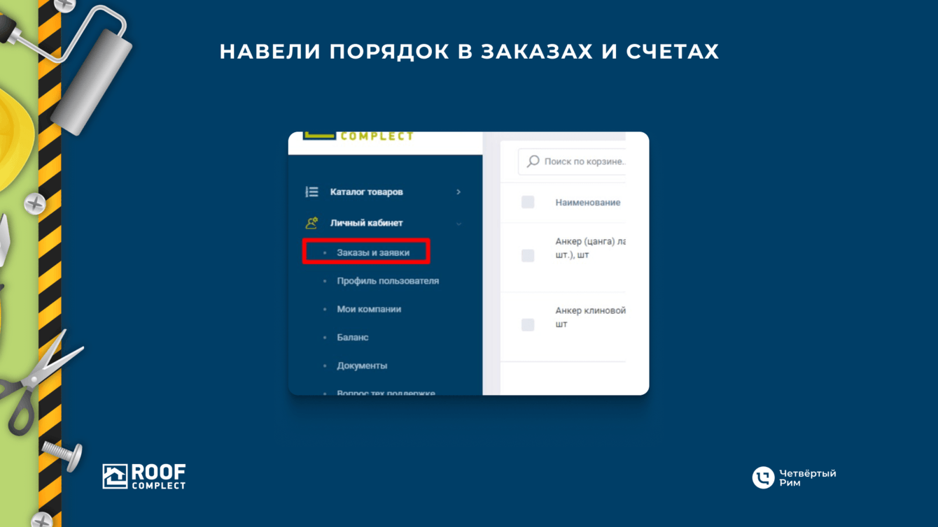 У «Руфкомплекта» огромный объем данных, который нельзя было потерять. Нам нужно было оценить масштаб того, что нужно интегрировать и выбрать гибкое решение. В личном кабинете мы реализовали несколько решений. А еще сделали инструкцию, которая помогает менеджерам и клиентам сориентироваться в интерфейсе.