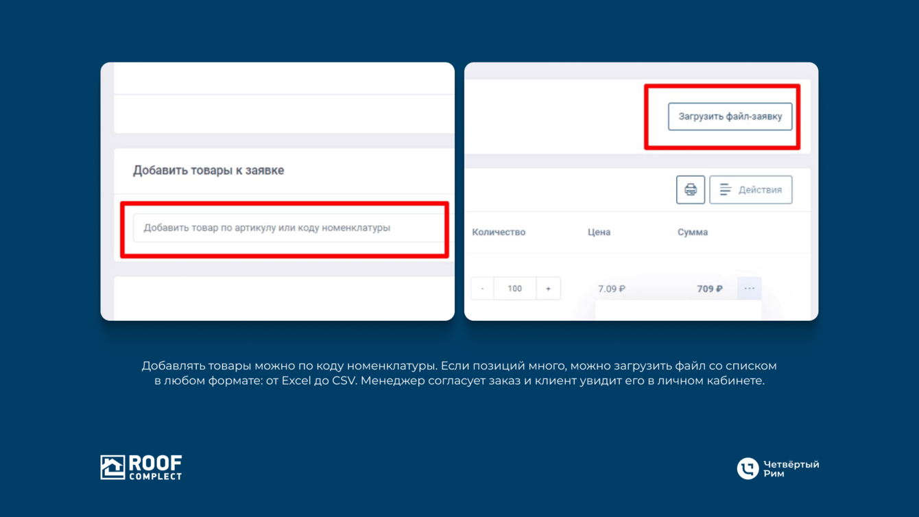 Сейчас добавлять товары можно по коду номенклатуры. Если позиций много, можно загрузить файл со списком в любом формате: от Excel до CSV. Менеджер согласует заказ и клиент увидит его в личном кабинете.