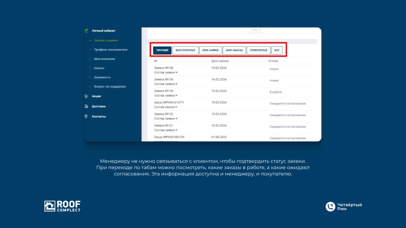 Менеджеру не нужно связываться с клиентом, чтобы подтвердить статус заявки. При переходе по табам можно посмотреть, какие заказы в работе, а какие ожидают согласования. Эта информация доступна и менеджеру, и покупателю.