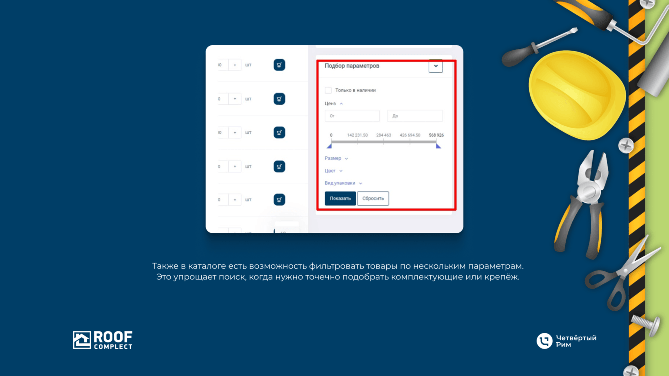 Также в каталоге есть возможность фильтровать товары по нескольким параметрам. Это упрощает поиск, когда нужно точечно подобрать комплектующие или крепеж.