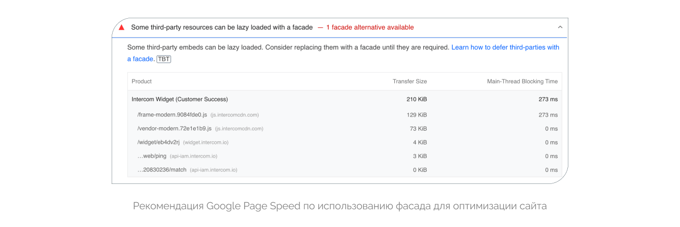 Если провести аудит страниц сайта с помощью Google Page Speed, то в рекомендациях сервиса можно увидеть совет использовать фасады при загрузке сторонних объектов. В нашем случае Google Page Speed предложил применить «ленивую загрузку» чата Intercom, который используется на платформе Webinar Group. Общее время блокировки основного потока (TBT) — 273 мс. В течение этого времени страница не отвечает на действия пользователя. Кажется, что это не много, но норма для подобного — 50 мс. Фасады помогают уменьшить показатель TBT.
