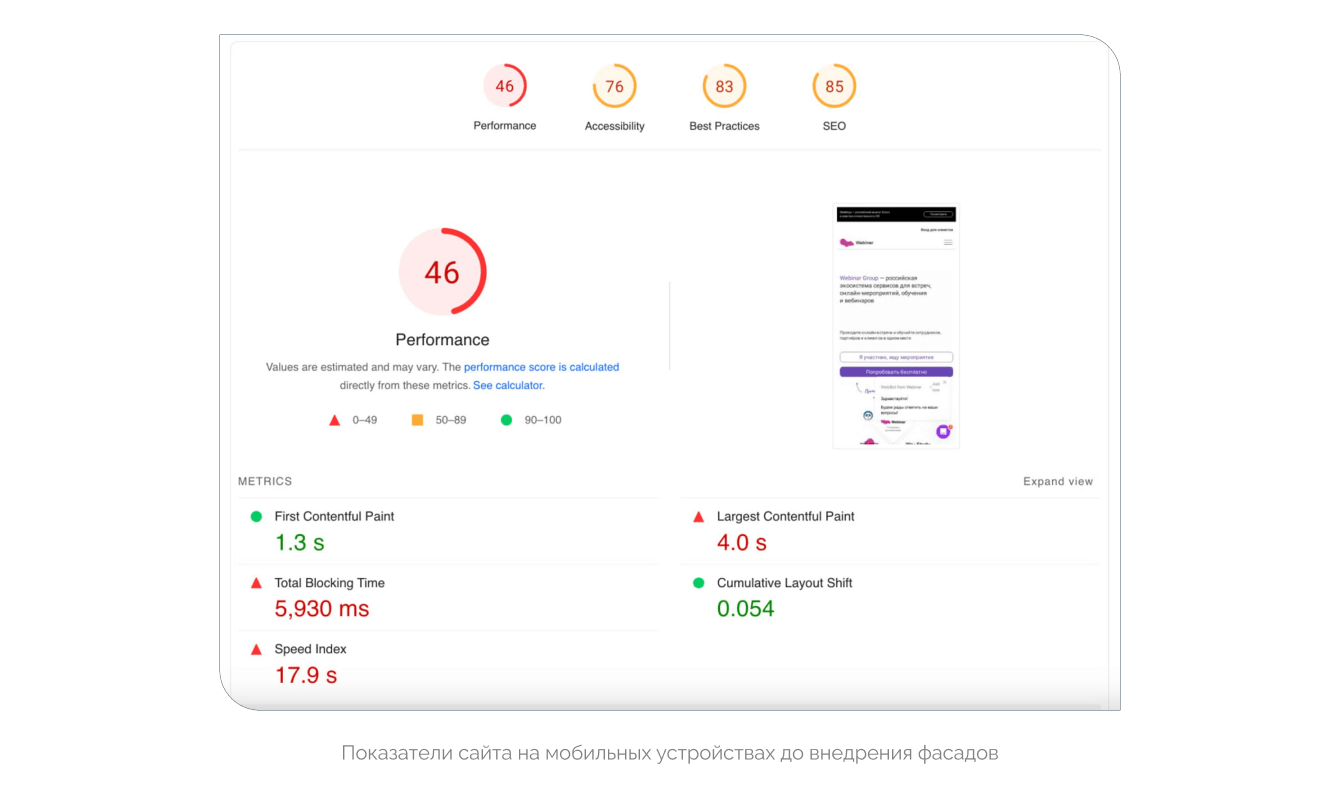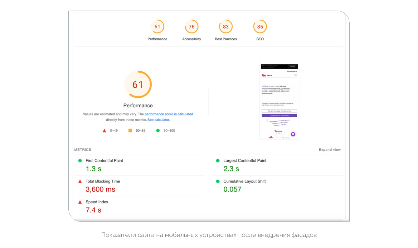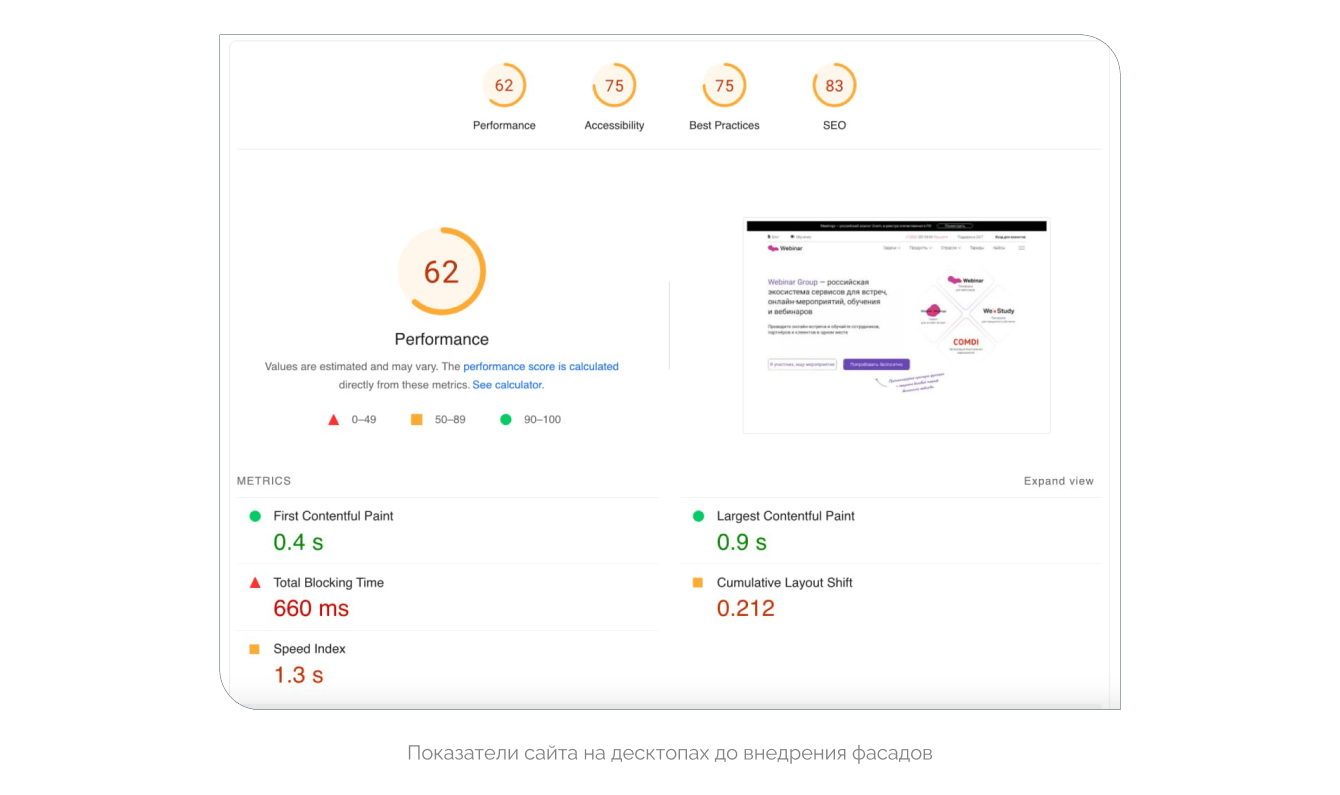 Если всё настроено правильно, то страницы сайта будут загружаться быстрее. Использование фасадов на платформе Webinar Group увеличило его производительность: