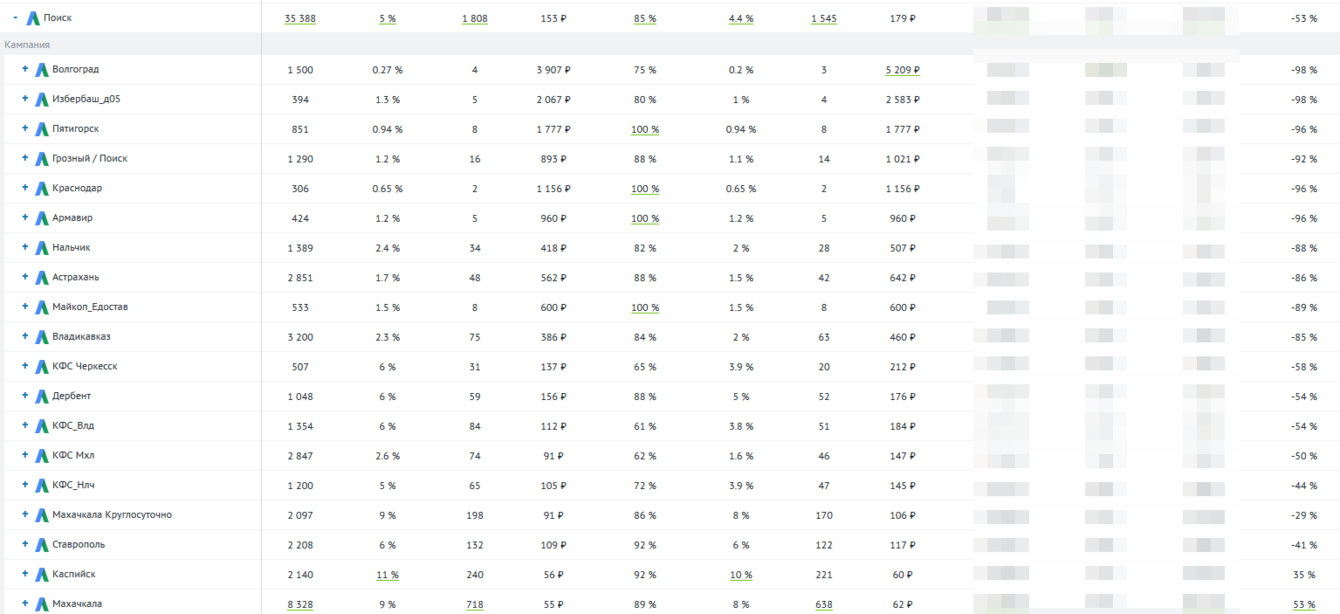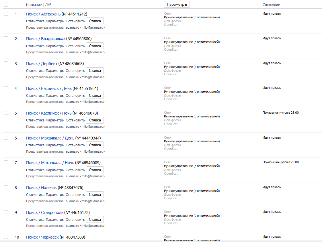 Старая структура РК была очень непонятной. В итоге мы разделили РК по городам, дополнительно в некоторых кампаниях разделили показы на дневные и ночные.