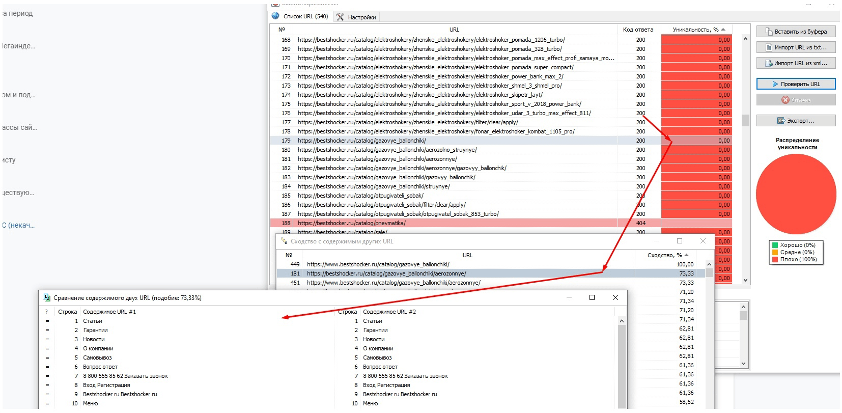 Результаты анализа оказались удручающими - большинство страниц имели очень высокую степень сходства между собой, о чем свидетельствовали процентные показатели уникальности. Это говорило о необходимости полной переработки контента в соответствии с лучшими практиками SEO.