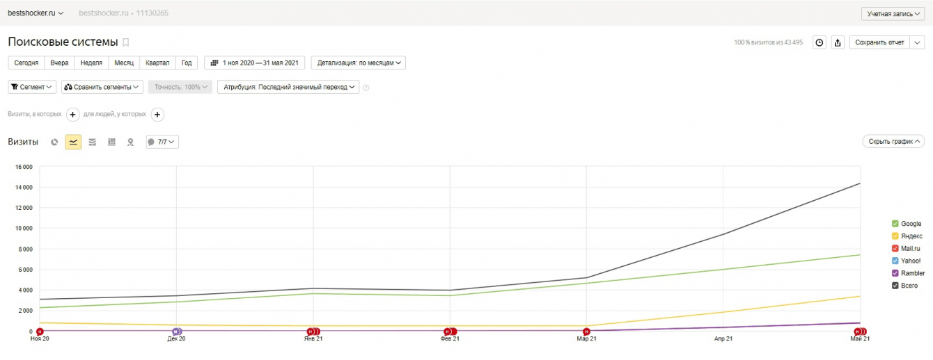 Одним из ключевых факторов, влияющих на успешность интернет-магазина, является сезонность спроса на продукт. Поэтому первым делом я проанализировал статистику переходов на сайт из поисковых систем за последний год.