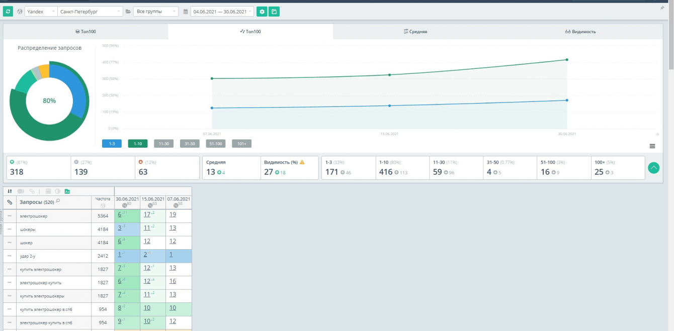 -В ТОП-10 выдачи вышли 416 релевантных запросов против 300 на старте (рост на 22%).