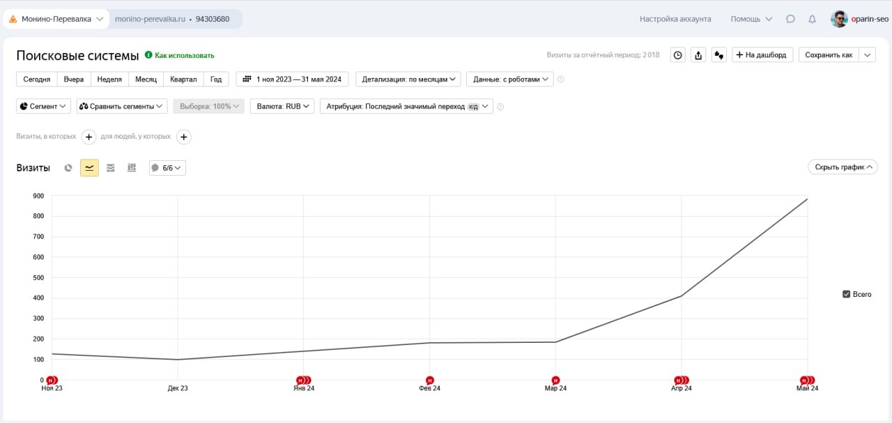 Однако наибольший эффект был достигнут спустя несколько месяцев, когда сайт успел полностью проиндексироваться и выйти на высокие позиции по большинству ключевых запросов. В мае, в пик сезона для данной отрасли, месячный трафик из поиска достиг 883 переходов.