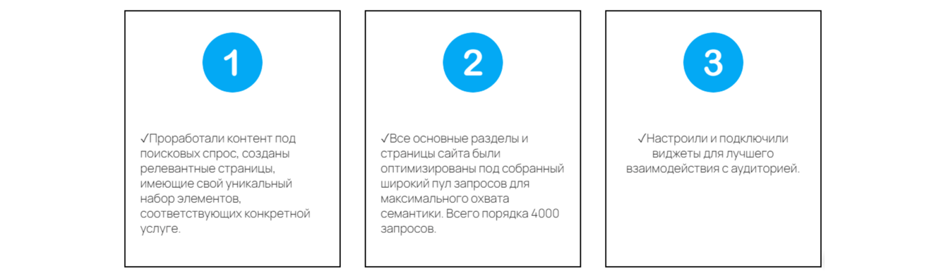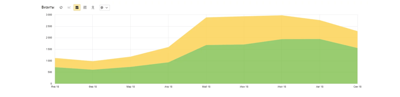 Сначала нами были точечно проработаны заголовки и МЕТА. Оптимизированы, а местами переписаны тексты под «ключи», с ориентацией на срез ТОПа создано порядка 15–20 новых страниц. Что в свою очередь и привело к первым заметным результатам и увеличению трафика в 2,5 раза (с 1000 до 2500 визитов).