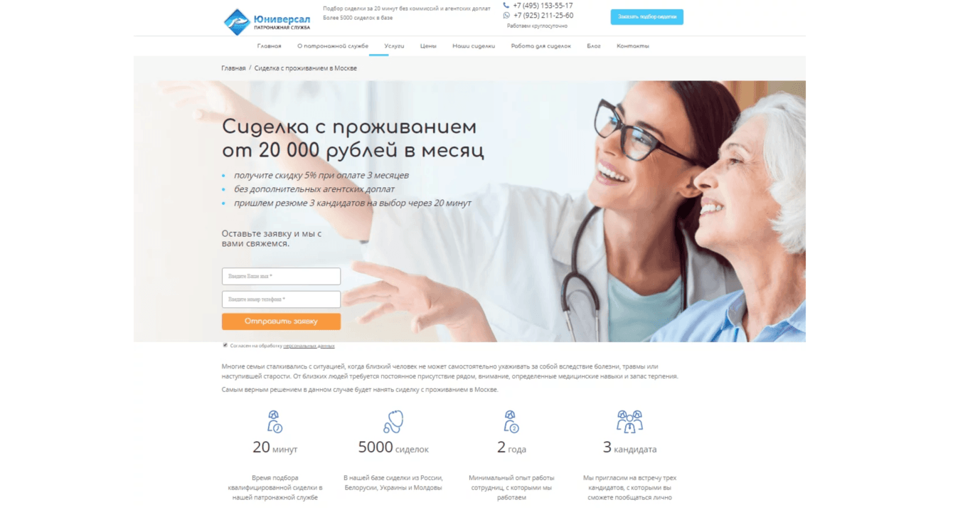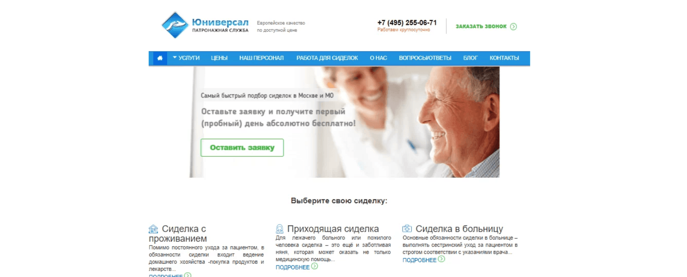 Клиент: компания «Юниверсал» является одним из лидеров среди служб по подбору сиделок. Имеет 3 действующих офиса продаж в Москве и Санкт-Петербурге и порядка 5000 сиделок в базе, готовых прийти на помощь в любой момент.