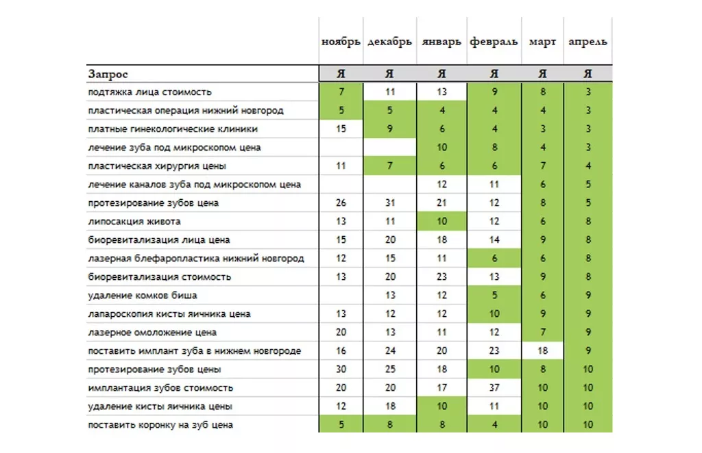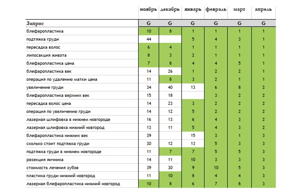 Также большую роль мы отвели контент-составляющей. Поменяли формат и объем текстов на сайте, оптимизировали заголовки. Отдельно проработали раздел статей, который ранее велся достаточно хаотично. Вместо небольших текстов до 3 000 знаков стали размещать экспертные статьи объемом в 16 000 – 20 000 знаков, дополняя их иллюстрациями и тематическими видео. При этом в написании статей и текстов на сайт стали участвовать действующие специалисты и врачи клиники, ведь только они смогут донести верную и достоверную информацию до клиентов. Вот лишь небольшой пример динамики позиций по запросам, результатов которой мы достигли за счет текстовой коррекции: