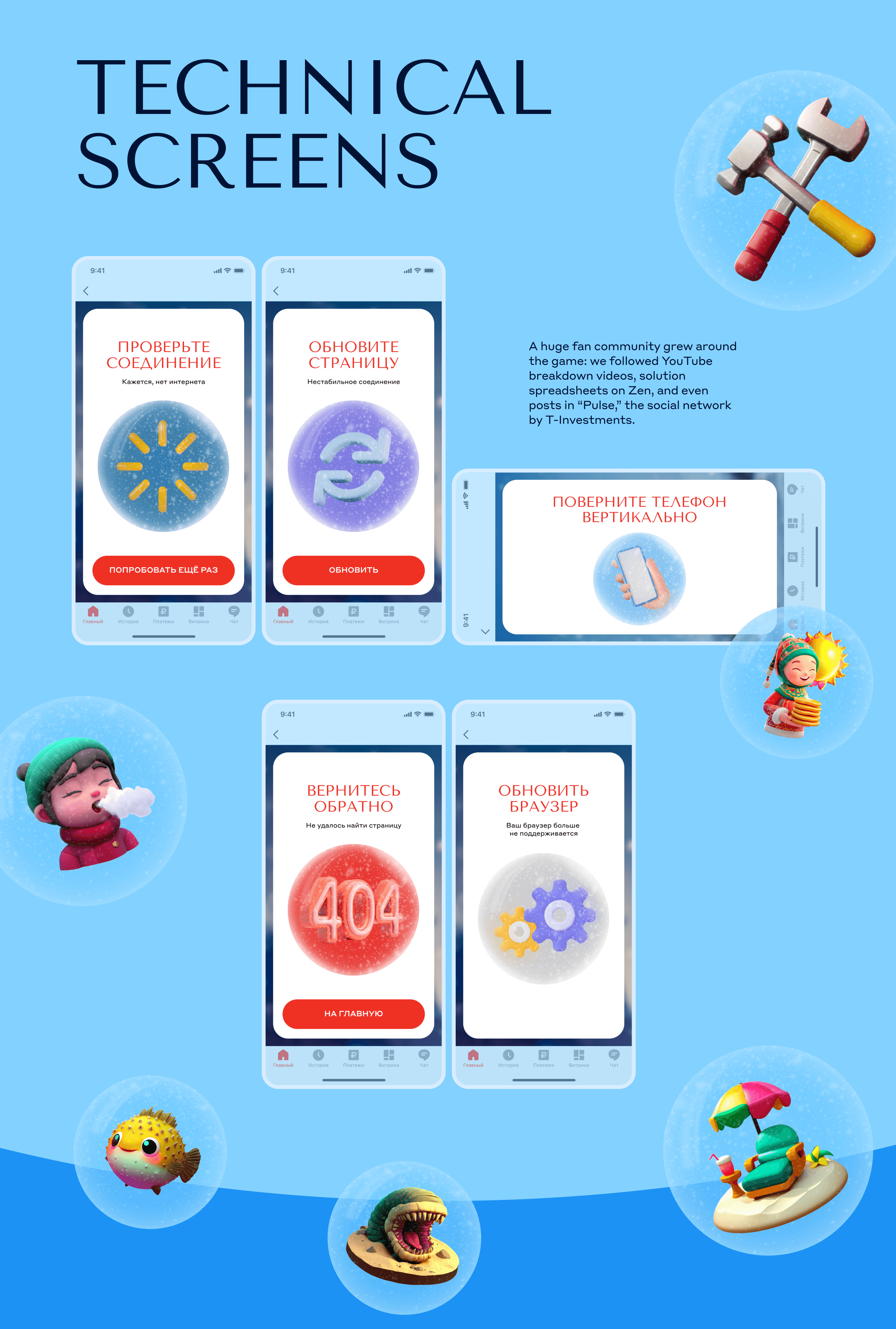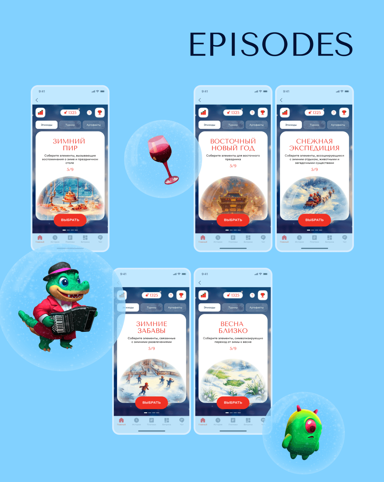 Мы искали стилистику, которая бы подошла широкой возрастной аудитории, так как в игру заходят клиенты от 14 до 65 лет. Остановились на зимнем сказочном визуале, вдохновленном старыми рождественскими открытками и хрустальными шарами со снегом. Нарисовали предметы в 3D-стиле и округлых формах для сочетания уютной атмосферы и чистого интерфейса