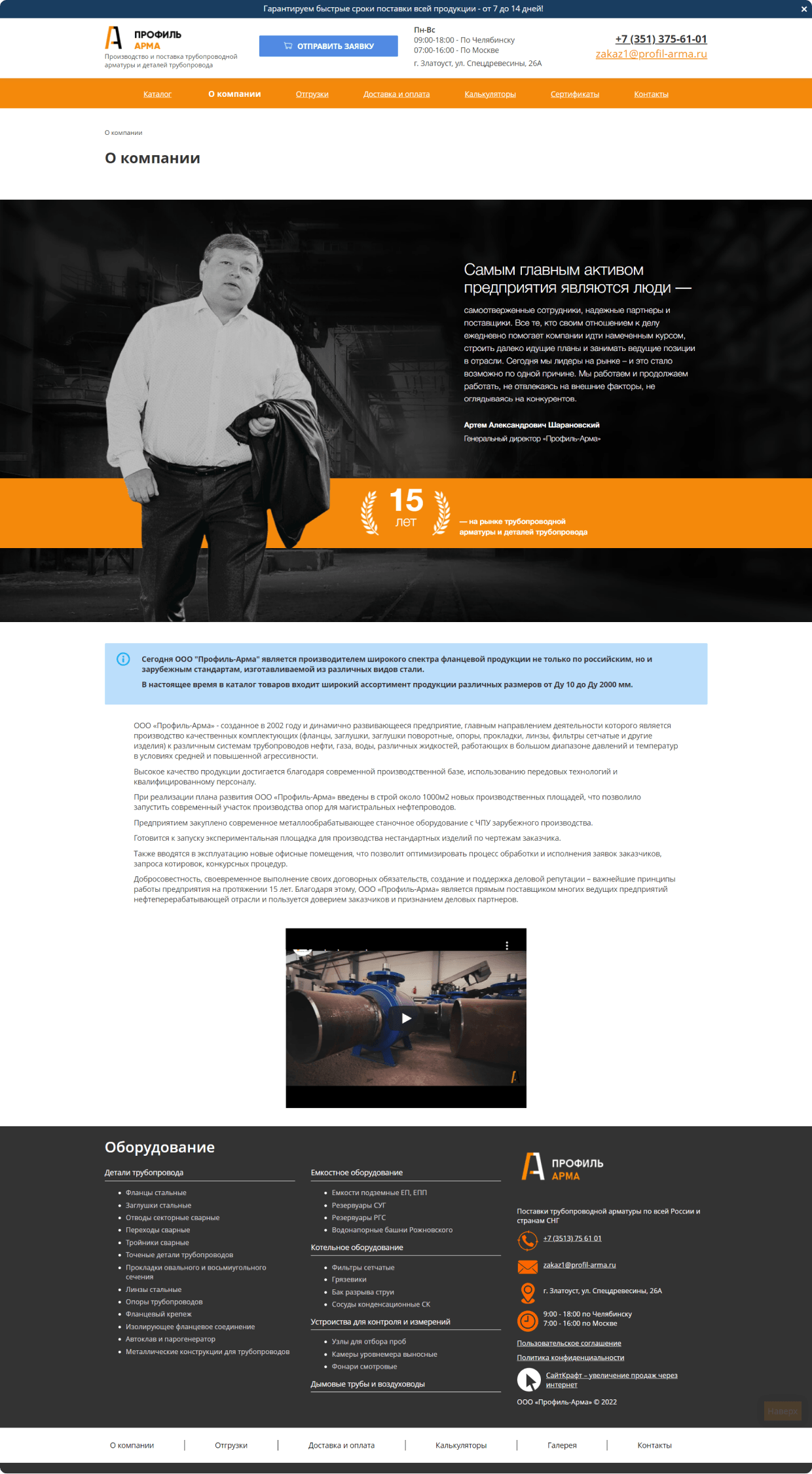 На странице о компании указали основные факты и разместили небольшой ролик.