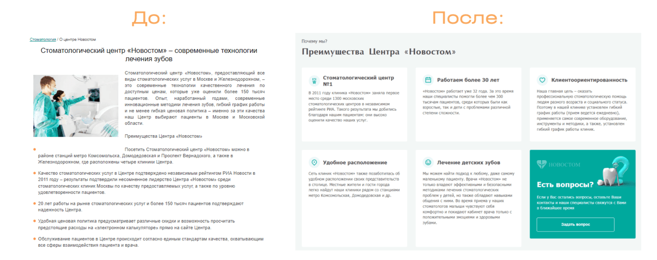 В декабре 2022 года к нам обратилась сеть московских стоматологий «Новостом». Клиент столкнулся с тем, что на сайт приходил трафик, но в основном он был информационный и редко конвертировался в продажи.