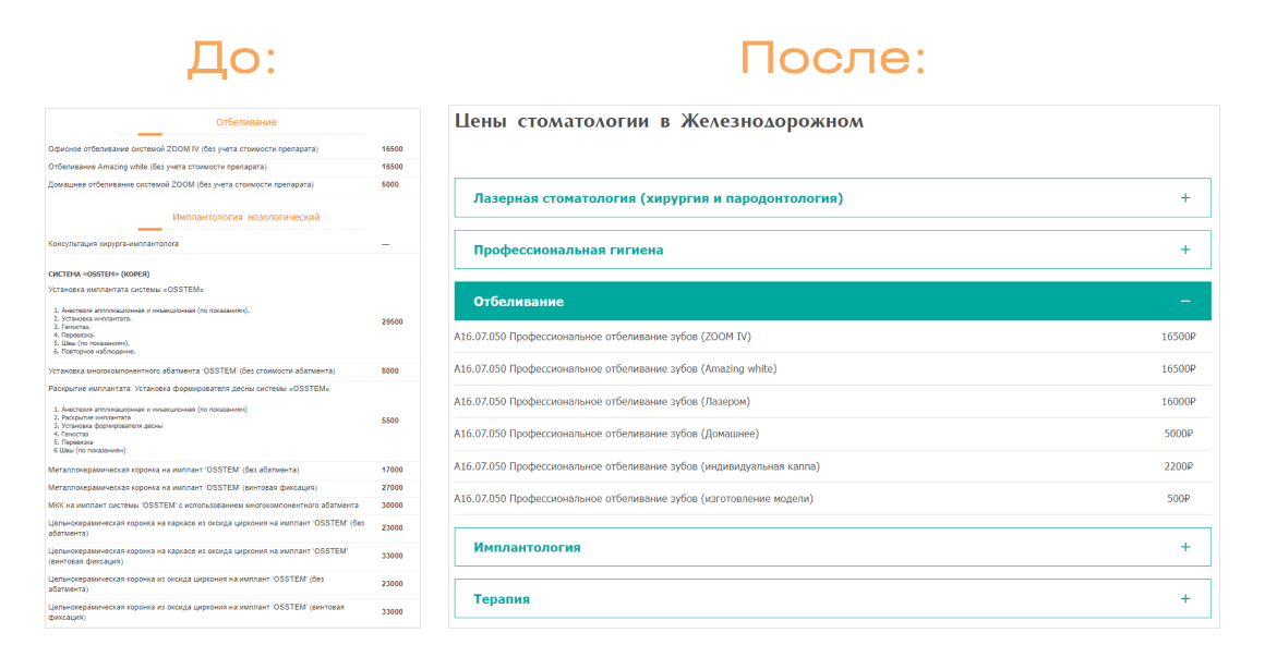 На старом сайте цены выглядели одним полотном текста – мы решили изменить механику навигации по блоку с ценами. Оставили все цены на одной странице, но теперь пользователю не надо скроллить в поисках услуги, а можно сразу открыть нужный блок с выпадающим прайсом.
