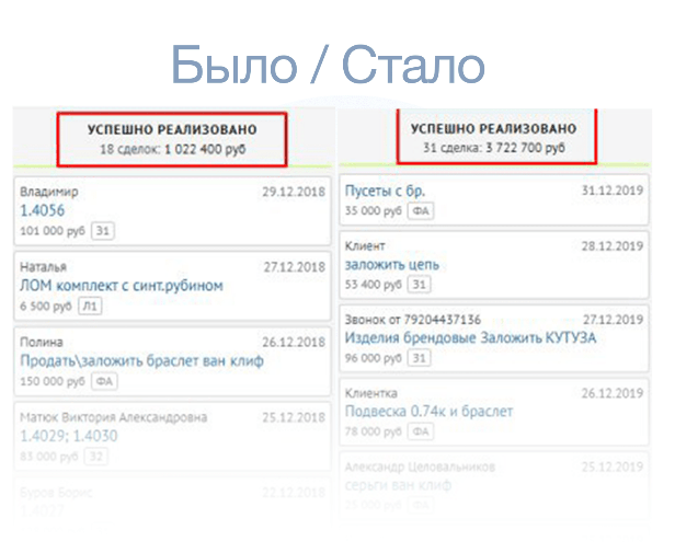 Стало: теперь менеджер зарабатывает по 1 000 рублей за человека, который доехал до ломбарда и стал клиентов. А также по 100 рублей за человека, который доехал до офиса, но в итоге отказался от сотрудничества.
