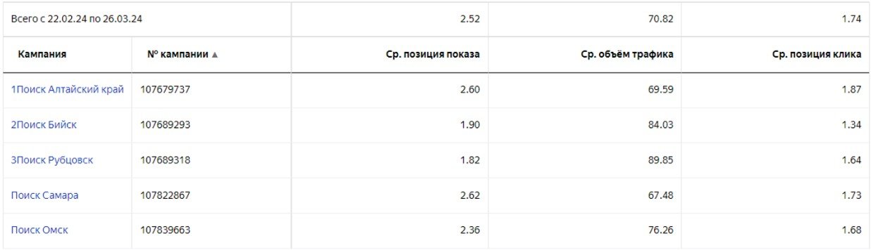 Гео РК: Алтайский край, отдельно Рубцовск, Бийск, Омская область и Самарская область. То есть нужно было запустить минимум 5 рекламных кампаний.