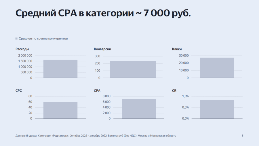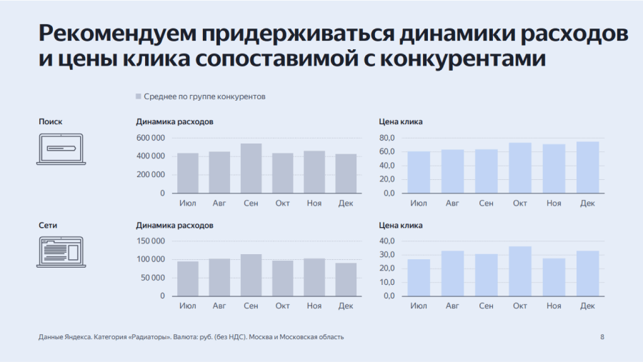 Нам очень повезло, что в процессе работы (было бы круто до старта, конечно, но после — тоже неплохо) мы получили экспертную оценку ниши «Радиаторы» от Яндекса. И могли сравнить её с нашими ожиданиями и результатами запуска рекламных кампаний.