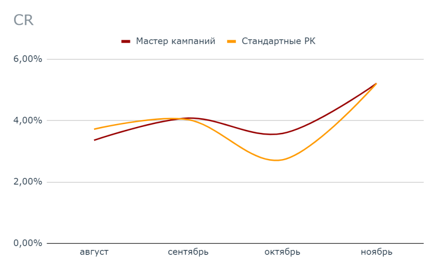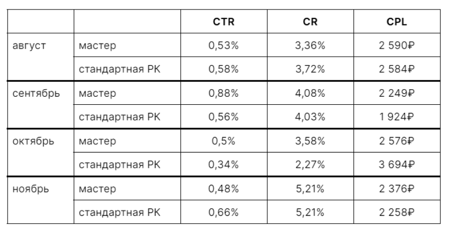 Как видно, основные метрики примерно на одном уровне как в Мастере, так и в стандартных РК. Но при этом есть значительная разница в количестве лидов — мастера в последние 4 месяца приводит их в 5 раз больше обычных кампаний.