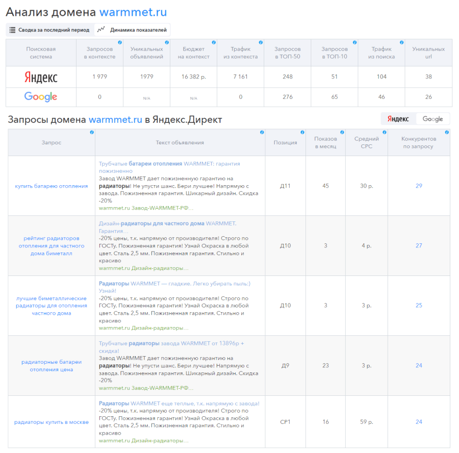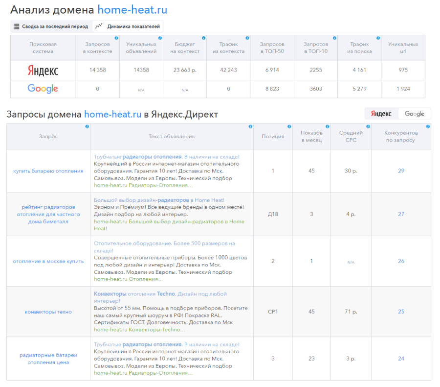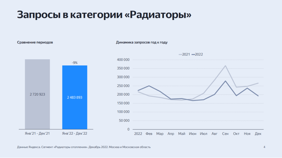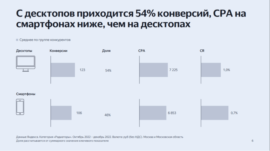 Позже, уже после запуска рекламных кампаний, мы получили экспертную оценку Яндекса ниши радиаторов в контекстной рекламе, которая отчасти подтвердила те данные, которые собрали мы, и дополнила нашу картину мира еще большим количеством данных. Поэтому в кейсе опираемся на аналитику Яндекса, так как она использовалась позднее.