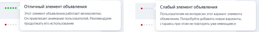 Обозначение удачных и слабых элементов в интерфейсе Яндекс Директа