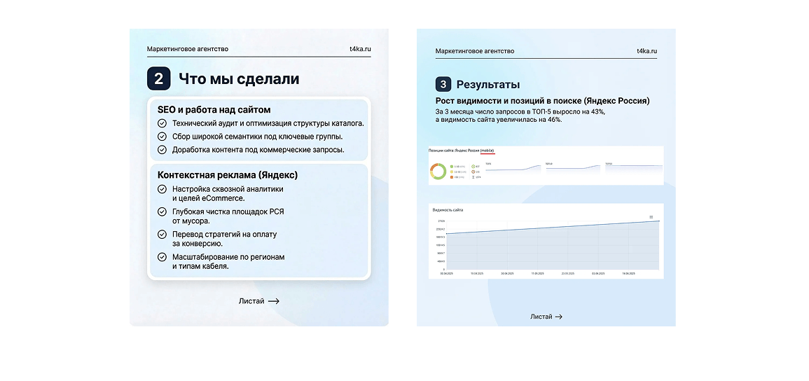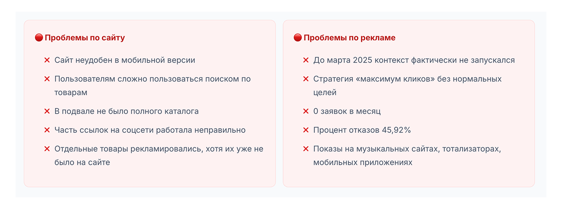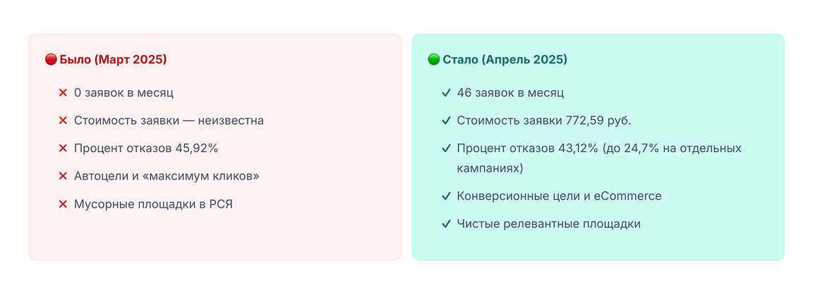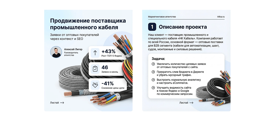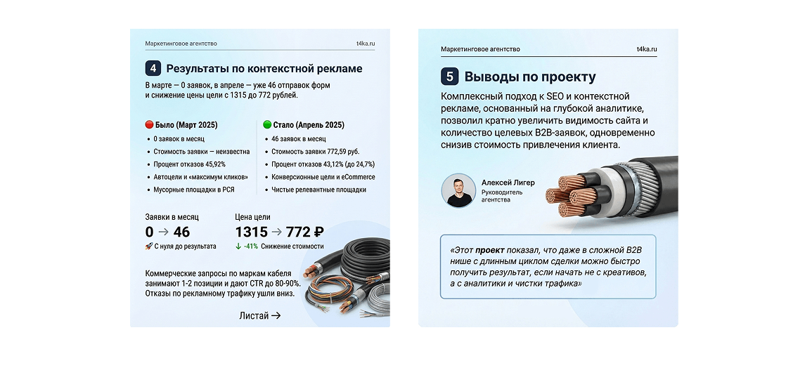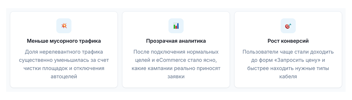 «Этот проект показал, что даже в сложной B2B нише с длинным циклом сделки можно быстро получить результат, если начать не с креативов, а с аналитики и чистки трафика. Подход, который мы использовали для НК Кабель, подходит любым поставщикам промышленной продукции и спецоборудования: сначала навести порядок в метриках и рекламных аккаунтах, затем аккуратно масштабировать удачные связки. Если вы хотите повторить это самостоятельно — начните с проверки целей в Метрике и отключения всего трафика, по которому вы не видите ни одной заявки, и только после этого думайте о росте бюджета.»