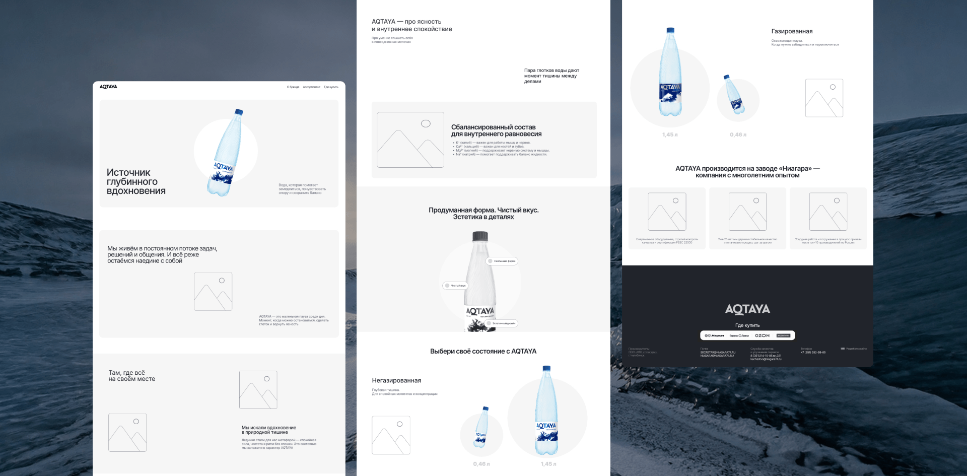В портфеле ООО «НВК «Ниагара» более десяти брендов, от питьевой воды до энергетиков. А недавно появился новый бренд воды — AQTAYA, и Надежда, бренд-менеджер компании, обратилась к нам за разработкой имиджевого сайта.