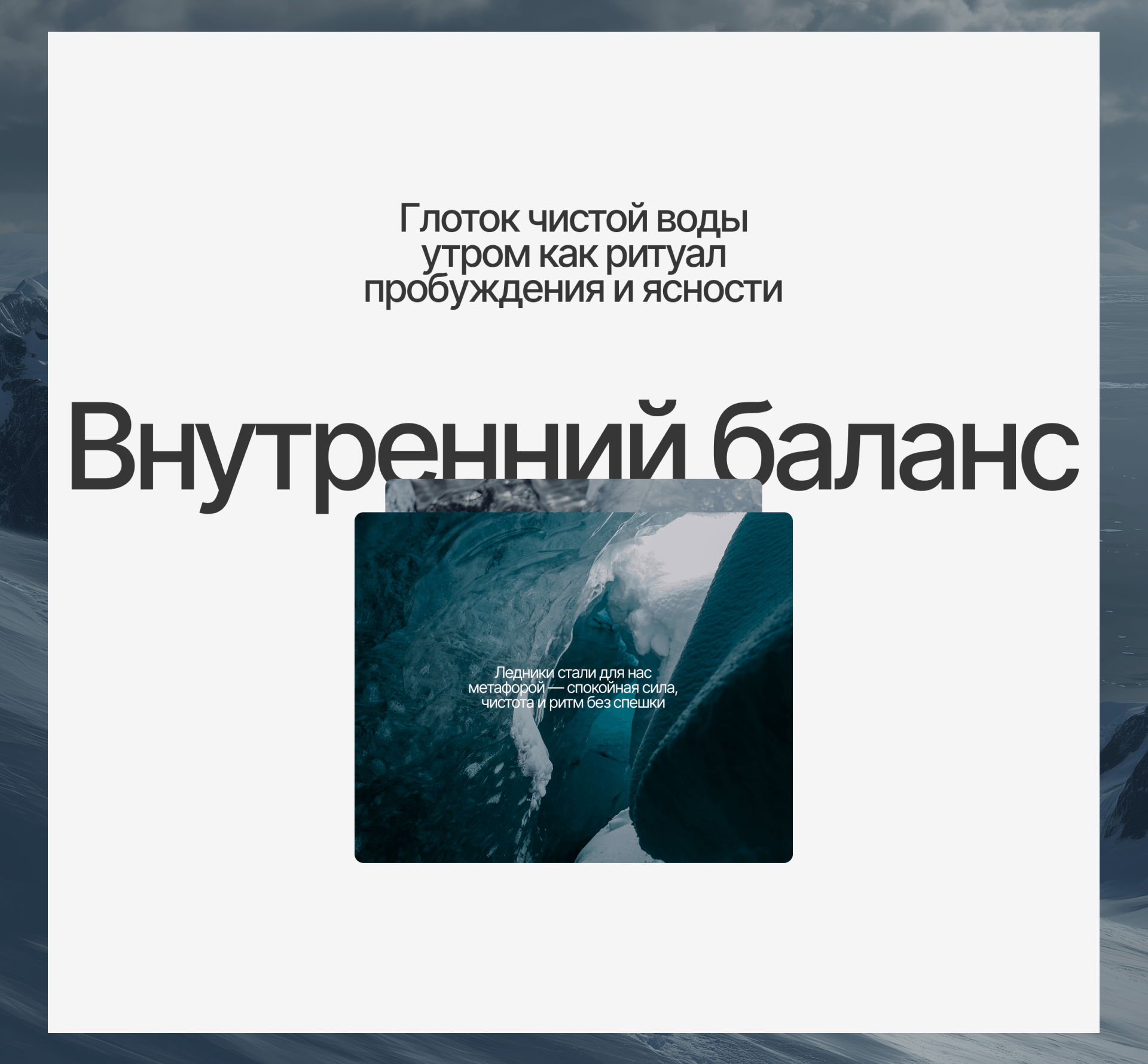 Второй блок формирует потребность и одновременно показывает философию бренда. Мы ориентировались на аудиторию, для которой вода — способ замедлиться среди дня. Поэтому погрузили пользователя в узнаваемый контекст: нескончаемый поток задач, общения, ответственности, и острая потребность выдохнуть.