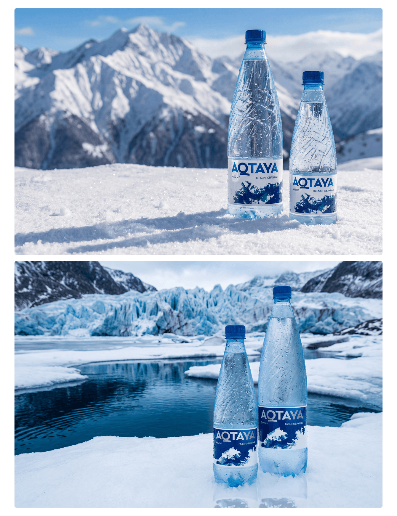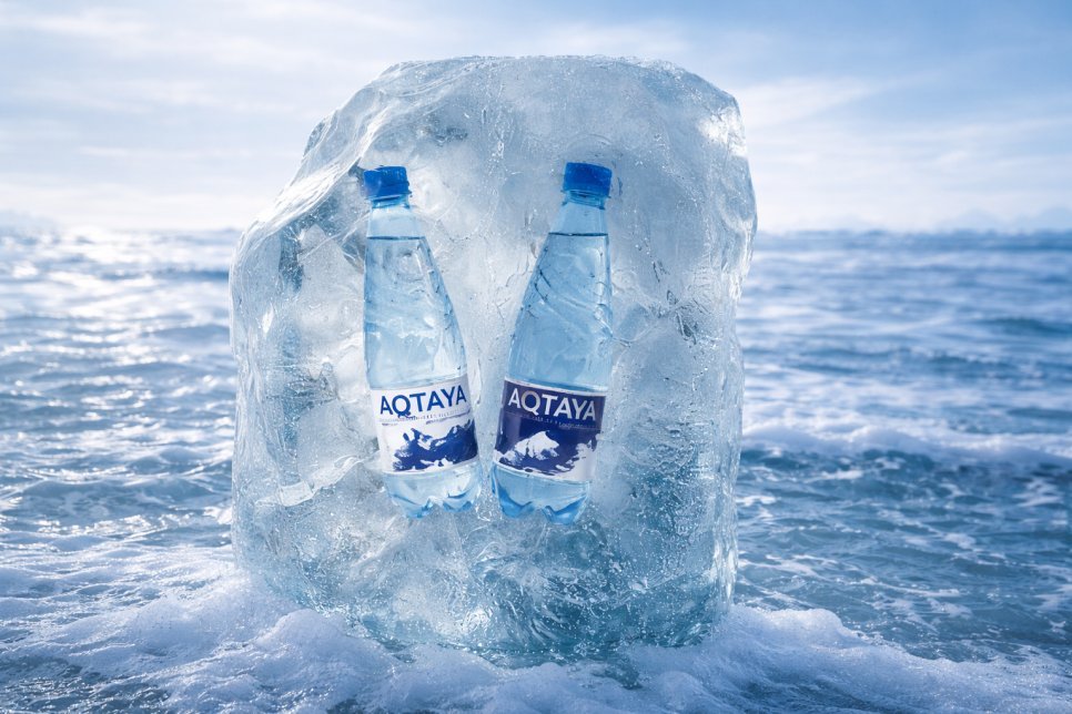 Визуальный акцент сделали на бутылке, погруженной в ледяную глыбу. Холодный свет и прозрачные грани льда создают ощущение чистоты и свежести. Бутылка выглядит так, будто только что появилась из глубины ледника. Такой образ сразу окунает в атмосферу спокойствия, тишины и природы.