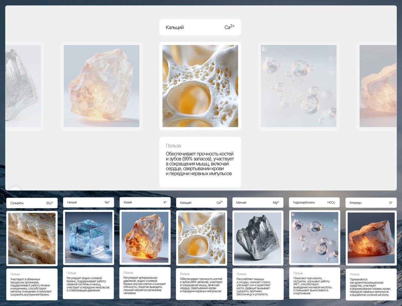 Аудитория бренда внимательно относится к своему состоянию и заботится о здоровье, поэтому на сайте есть состав воды. Задача была непростая, показать состав хотелось необычно. Классические варианты с кругом, в котором есть компонент и текст, давно выглядят скучно.