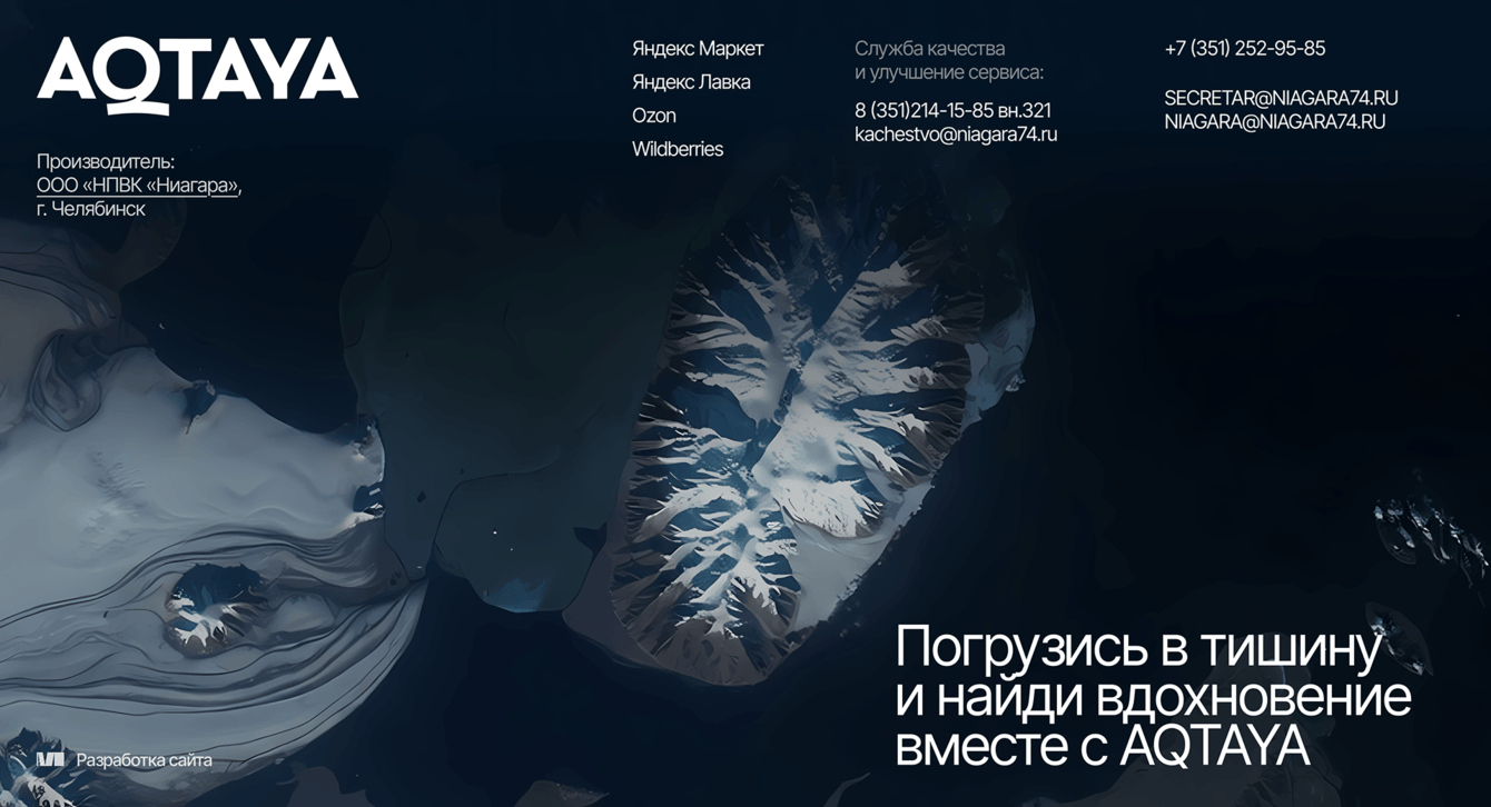 В результате у бренда воды AQTAYA появился имиджевый сайт, который раскрывает философию продукта и позволяет рассказать о нем гораздо глубже, чем это возможно на общем сайте производителя.