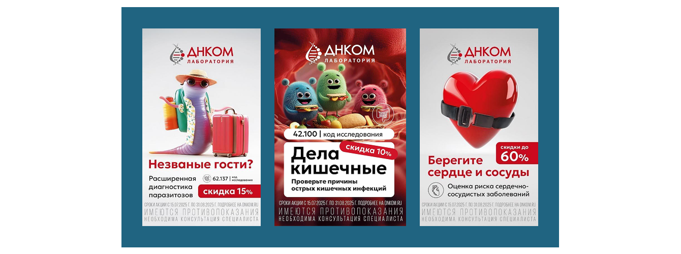 В июле ДНКОМ сформировал сезонный набор анализов с привлекательной стоимостью, которые вошли в единую акцию. Однако было принято решение продвигать конкретные анализы отдельными флайтами. Такой вариант позволил сконцентрировать внимание на креативах для конкретных исследований, не скатываясь в сухое перечисление акционных позиций. Тон коммуникации во флайтах использовался от дружеского неформального до дружеского профессионального. Добавление ярких, мультяшных персонажей, создает позитивное и непринужденное восприятие, особенно в областях, сложных для визуализации по этическим причинам.