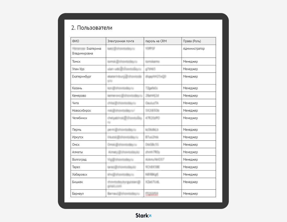 Теперь если у заказчика поменяется подрядчик или даже полностью сменится штат сотрудников, ему достаточно будет открыть паспорт внедрения, где он найдёт всю необходимую информацию: все тонкости настройки, доступы к аккаунтам, пошаговое описание воронок продаж, контакты специалистов по внедрению и многое другое.