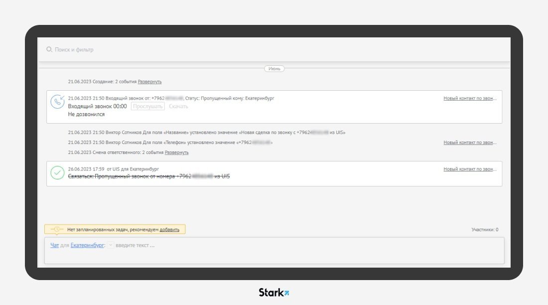 После подключения телефонии входящие звонки перестали теряться. При поступлении входящего звонка с неизвестного номера в системе amoCRM автоматически создается новый контакт. При пропущенном звонке для менеджера создается задача «перезвонить».