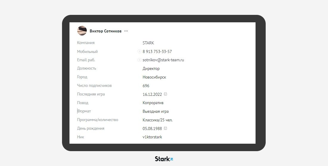 Поскольку услуги нашего заказчика пользуются спросом для проведения корпоративных мероприятий, мы разбили карточки клиентов на два вида: карточка контактов для физлиц и карточка компании для юридических. При составлении полей мы учли всю информацию, которую важно уточнить у клиента и не потерять.