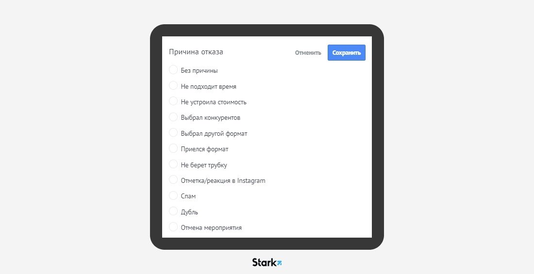 Мы уделили отдельное внимание пункту «Отказ от сделки» и внесли 10 возможных причин. Таким образом, у нашего заказчика будет возможность анализировать и улучшать всю воронку, особенно в тех моментах, когда клиенты отказываются от проведения мероприятия.