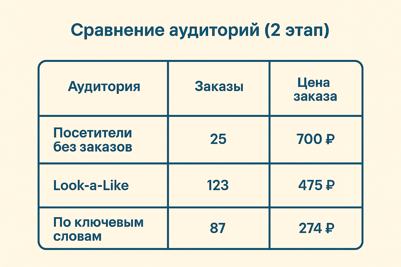 - Аудитория Look-a-Like: 123 заказа со средней стоимостью 475 рублей.