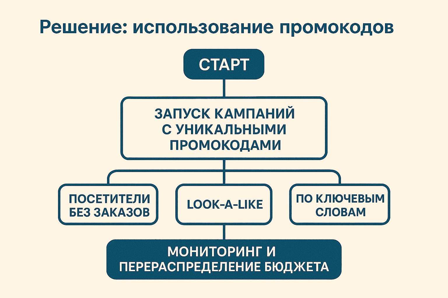 Запуск кампании в РСЯ с использованием уникальных промокодов и целевой посадочной страницы.