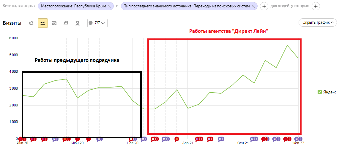Это был непростой год для seo-продвижения: ТОП выдачи на начало 2021 г. сильно отличался от того, каким он стал уже через год. Летом Яндекс обновил алгоритмы, и многие основные конкуренты сильно просели по видимости. Несмотря на это, мы смогли занять лидирующие позиции в выдаче. Хотя изначально сайт клиента не входил по основным запросам даже в ТОП-10 органической выдачи Яндекса по Крыму.