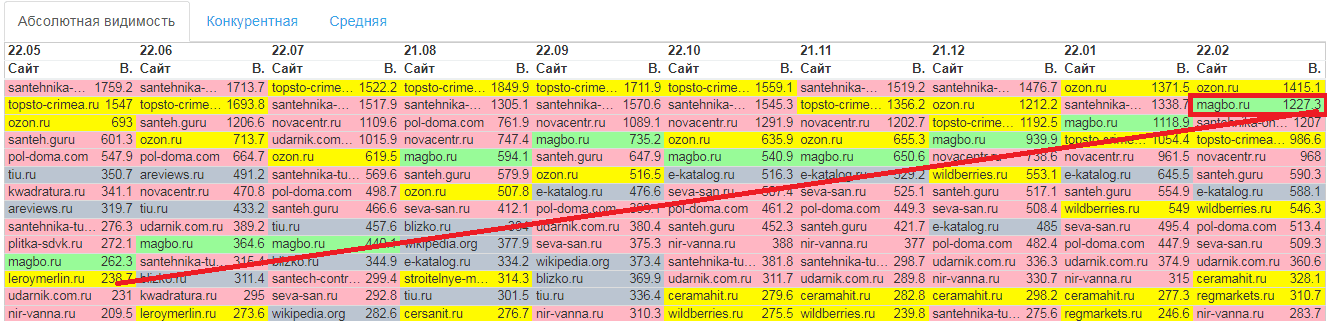 В данный момент на первом месте по абсолютной видимости находится маркетплейс «Озон», который не является прямым конкурентом.