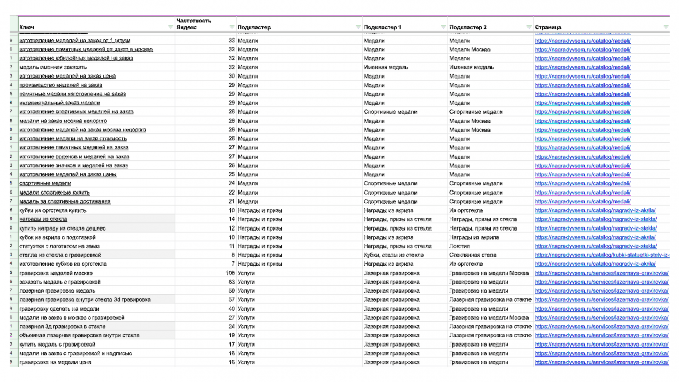 Всего было собрано руками более 1 000 ключей со спросом в Google и Яндекс: