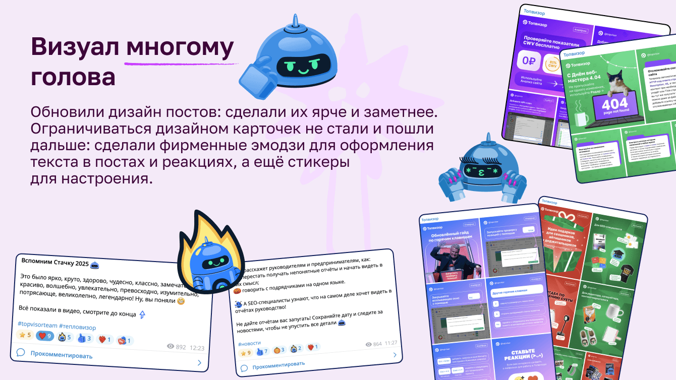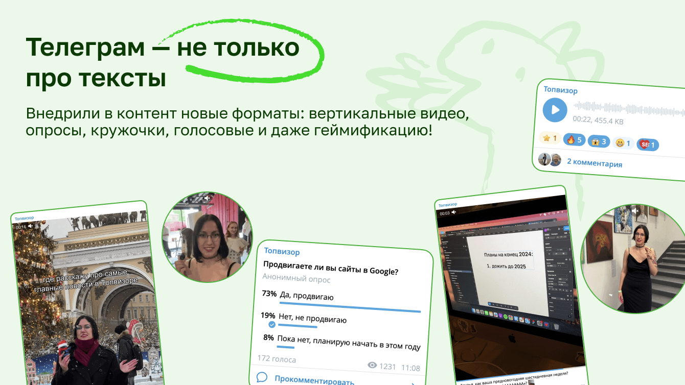 Поскольку у нас сложная B2B-платформа, контент-маркетинг и SMM — основные каналы коммуникации с пользователями. С их помощью мы рассказываем о возможностях сервиса, чтобы привлекать внимание ко всем инструментам платформы, доносим до клиентов его ценность и формируем лояльность. За годы развития канала в Телеграме мы добились поставленных целей: вырос объём использования инструментов, о которых рассказываем в карточках, постах и кружочках, наши креативы запоминаются аудитории. Также Топвизор стал широко известен в профессиональной среде. Люди знают или точно слышали о сервисе, даже если не являются клиентами. Соцсети, в частности Телеграм, работают на нашу экспертность и занимают видное место в пиаре.