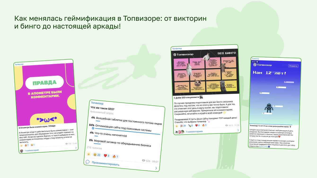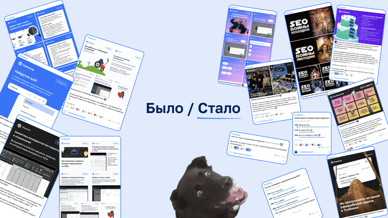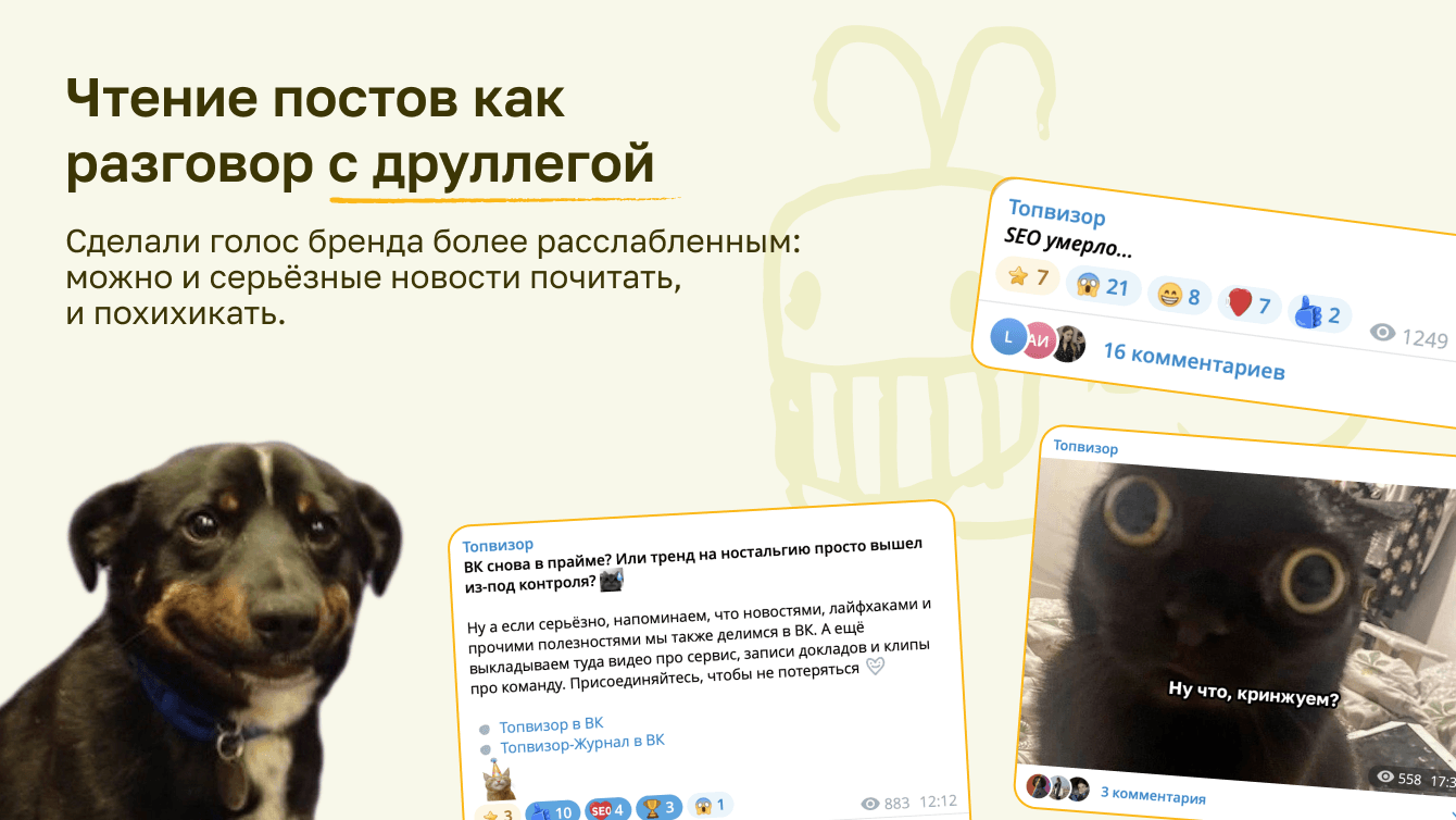 Топвизор — сервис поисковой аналитики для SEO-специалистов, маркетологов и всех, кто работает в диджитал. Более десятка инструментов для SEO и не только! Наш сервис — сложный с технической точки зрения продукт. И изначально Телеграм-канал задумывался как стандартный информационный ресурс. Мы рассказывали подписчикам об обновлениях, новых фичах и делились полезным из Топвизор-Журнала. Однако при таком контенте публикации носили больше утилитарный характер. Вовлечённость была довольно низкой, у бренда не было своего лица в соцсетях. Необходимо было срочно что-то менять, чтобы не стать «ещё одной лентой новостей».