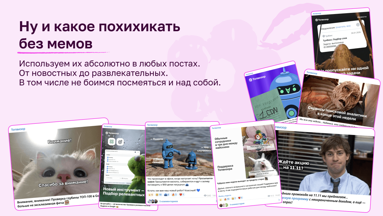 Делаем отсылки к мемам не только в публикациях, но и в заголовках. Не боимся экспериментировать.