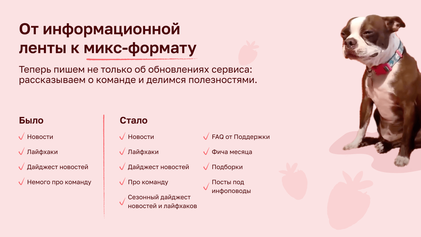 Стали публиковать больше полезных постов: увеличили количество лайфхаков, создали «FAQ от Поддержки» и «Фичу месяца». Целых три рубрики, в которых рассказываем, как использовать сервис по максимуму, и заранее решаем вопросы, которые могут возникнуть у пользователей. Разнообразили дайджесты, добавили развлекательные посты под инфоповоды и увеличили количество публикаций про команду.