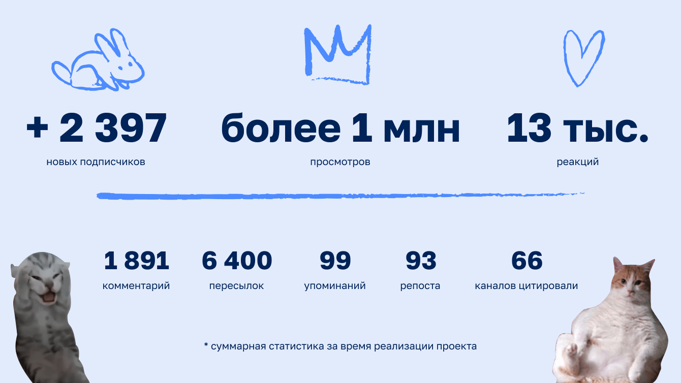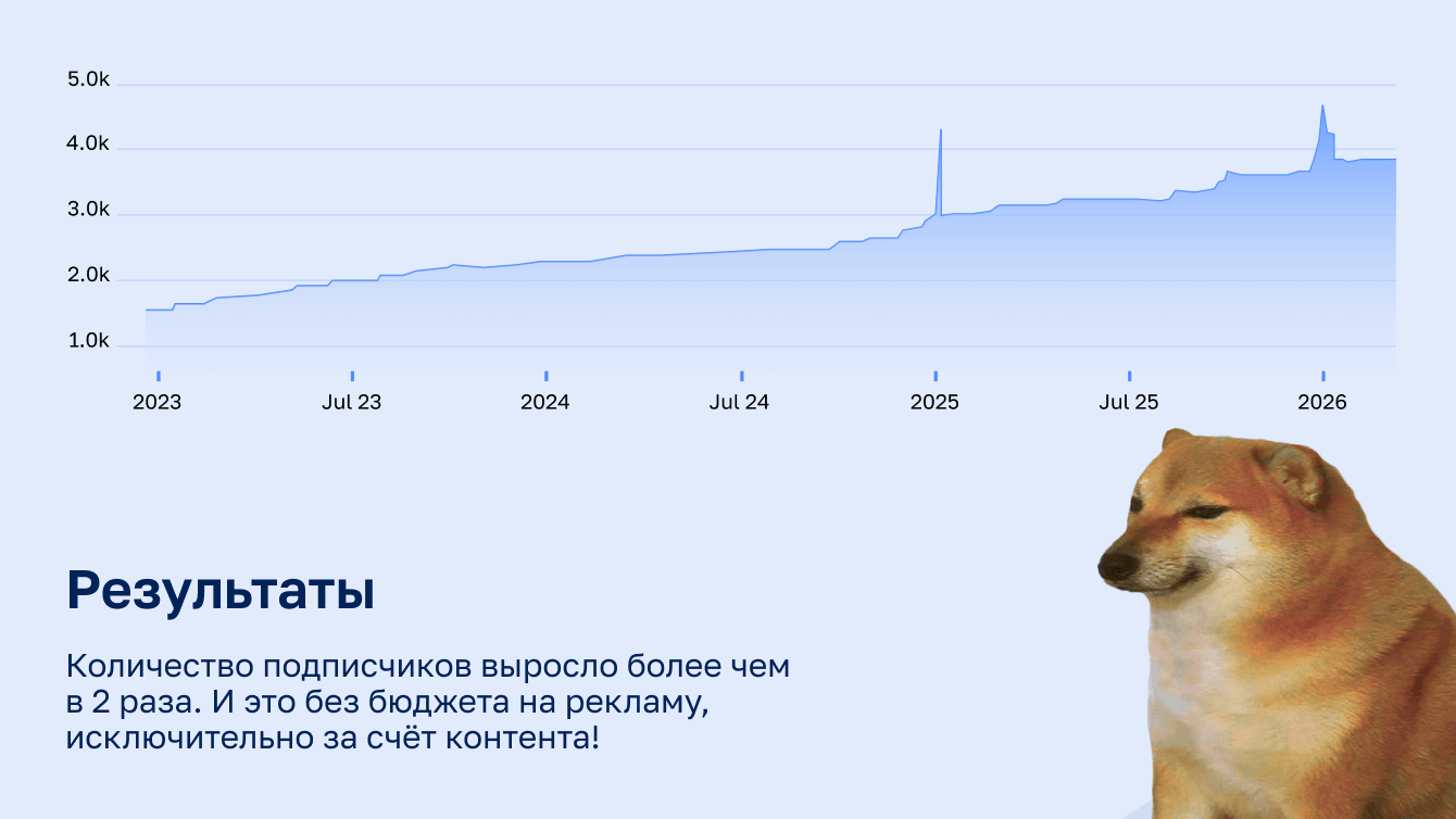 За это время количество подписчиков увеличилось вдвое только за счёт контента (даже боты нападали дважды!). Публикации набрали свыше 1 млн просмотров и 13 тыс. реакций. А главное — благодаря лайфхакам траты на инструменты выросли в 1,5–2 раза.