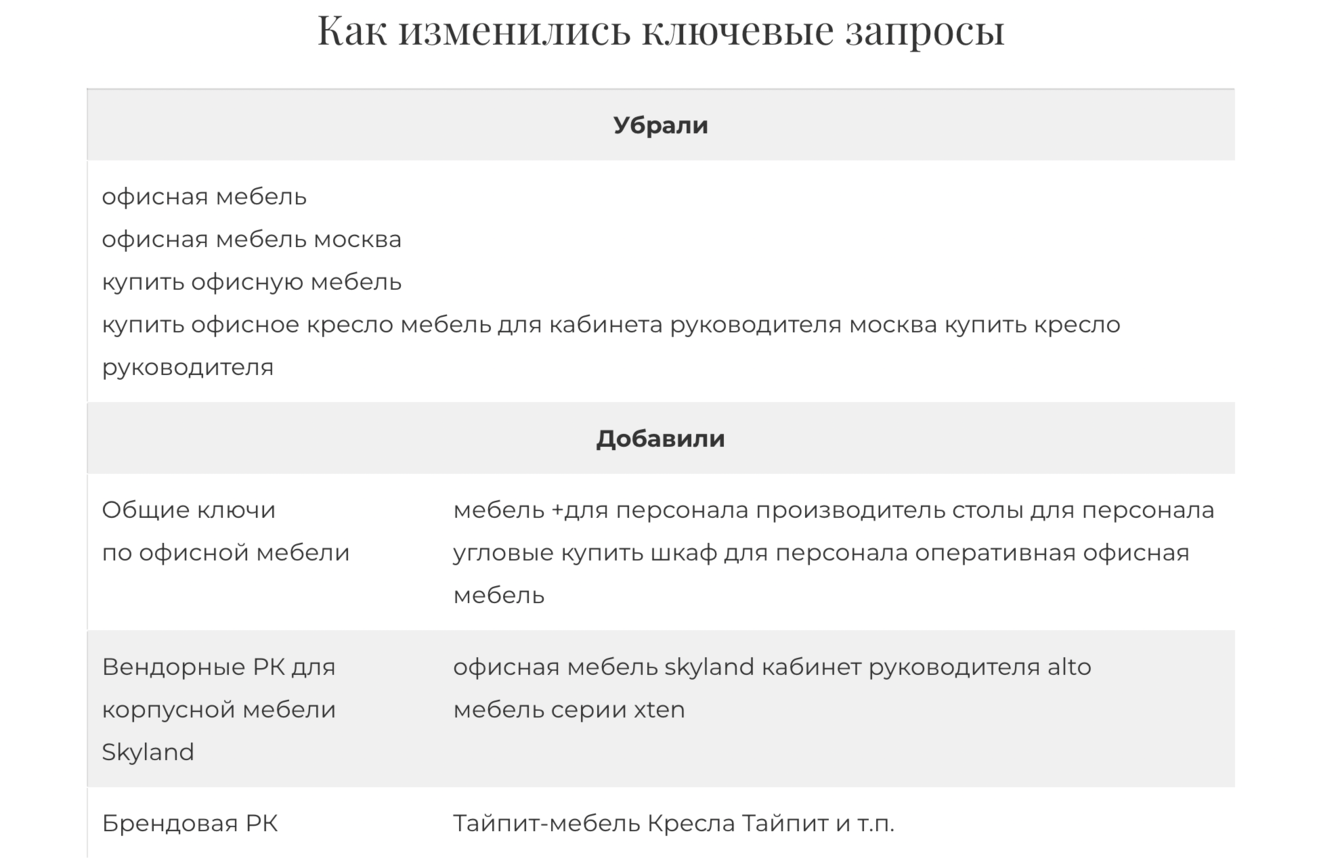 Еще раз проанализировали вводные (высокая конкуренция, утвержденный до конца года рекламный бюджет и ориентация на Москву и область) и решили отказаться от высокочастотных запросов, сфокусировались на средне- и низкочастотных. Показы по высокочастотным запросам стоят дорого: покупатели часто используют их для поиска продукции, а продавцы — для показа рекламы. SF.RU и «Тайпит-мебель» вышли из этой гонки и начали собирать трафик с запросов, которые используются реже. Это привело к повышению трудозатрат, но в то же время позволило точнее сформировать список минус-слов и понять запросы потребителей. На выходе получили более «чистый» трафик.