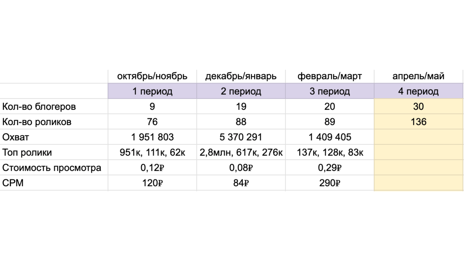 Сейчас продолжаем работу с брендом в данном направлении и постепенно масштабируемся. На текущие 2 месяца увеличили пул авторов до 30 — это позволит нам увеличить количество единиц контента до 136 и охватить еще больше аудитории, при этом сохранить показатель стоимости просмотра на уровне 10-20 копеек.