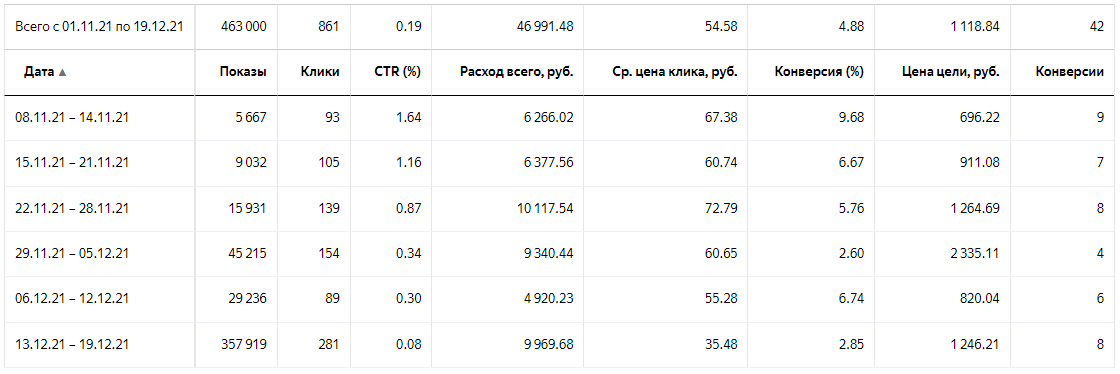 Говорить о результатах еще рано, но получились они следующие: 42 заявки по 1118 рублей. Начиная с конца ноября стоимость заявок стала расти – это связано с тем, что начался не сезон. За данный период контекстная реклама привела на сайт 74,7% трафика.