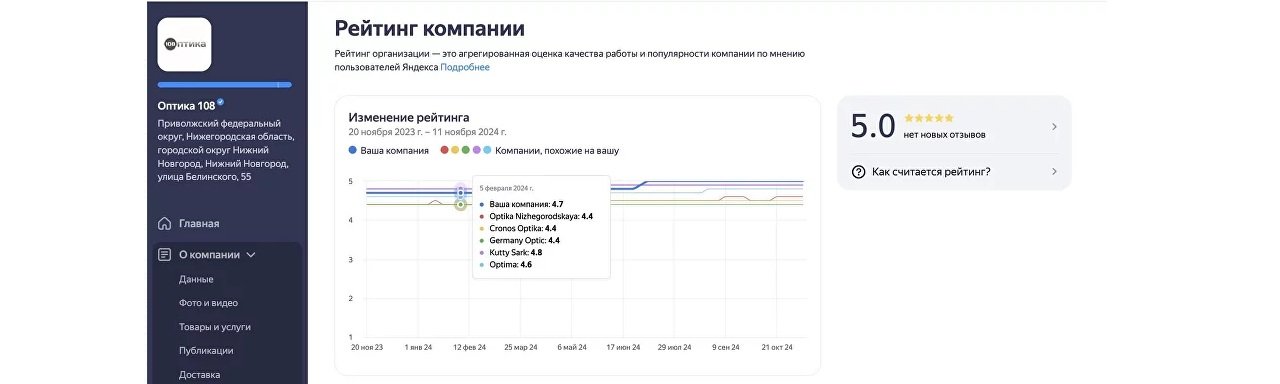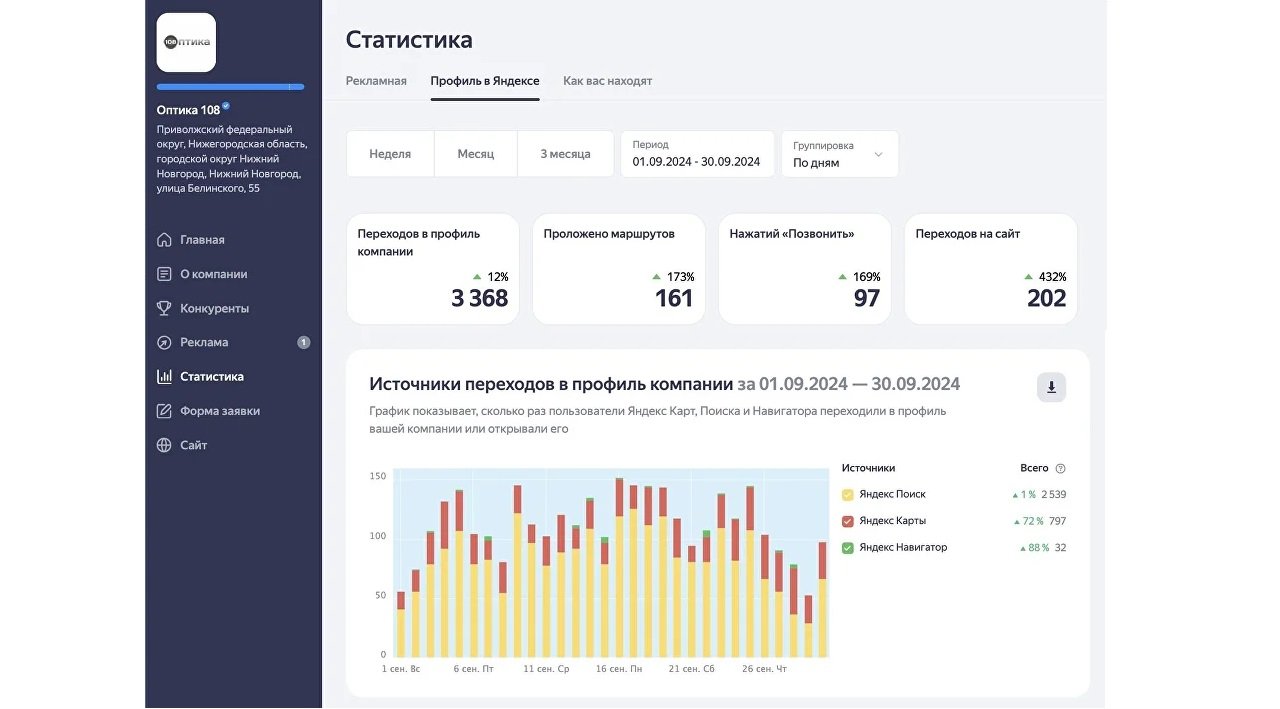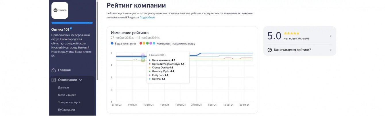 К июню 2024 г. карточка компании «Оптика 108» вышла на первое место по доле трафика среди конкурентов и сохраняет первое место по настоящее время несмотря на то, что основные конкуренты – это известные крупные сети оптик.